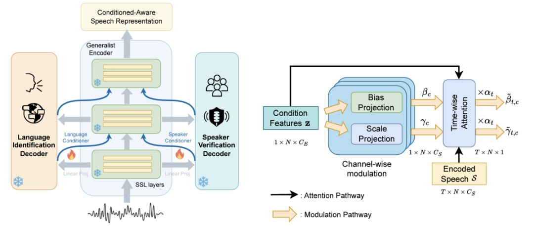 如论文提及,CA-SSLR方案及其时间通道注意力调节器,只有解码器的调节器和线性投影是可训练的,所有其他参数在适应过程中都被冻结。CA-SSLR通过集成中间LID/SV条件、保持预训练参数冻结(左)来改进SSL功能。可训练的时间通道注意力调节器集成了语言和发言人预测(右)。