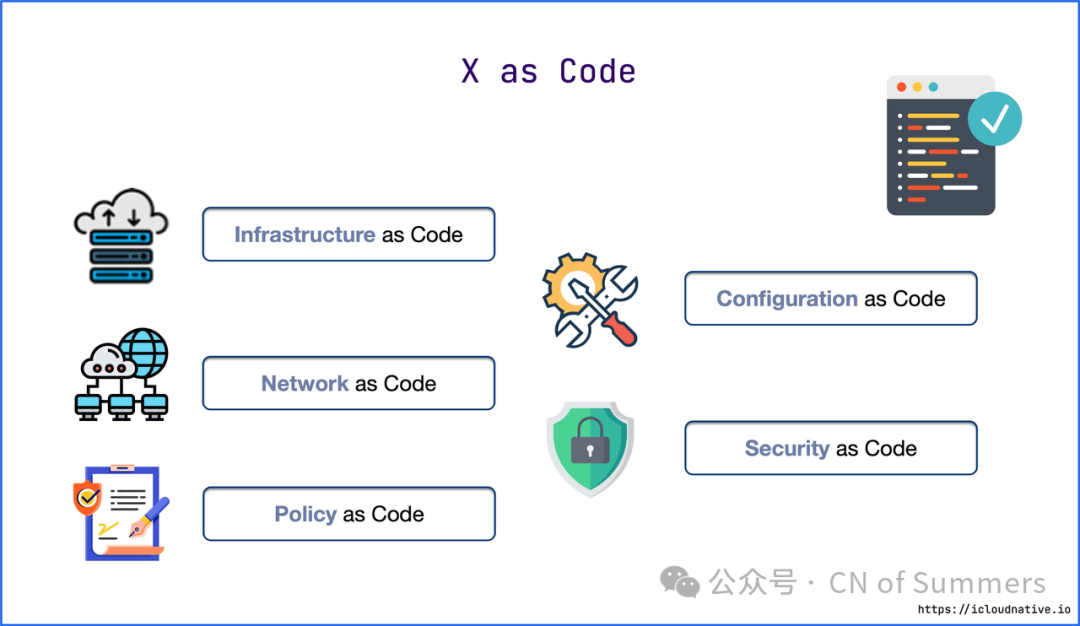 • 可以创建包含基础架构规范的声明式配置文件,从而便于编辑和分发配置。 • 可以确保每次配置的环境都完全相同。 • 可以进行版本控制,所有的变更都会被记录下来,方便溯源。 • 可以将基础设施划分为若干个模块化组件,并通过自动化以不同的方式进行组合。 当然,广义上的 IaC 不仅仅只关于基础设施,还包含了网络、安全、配置等等,所以广义上的 IaC 又叫 X as Code。