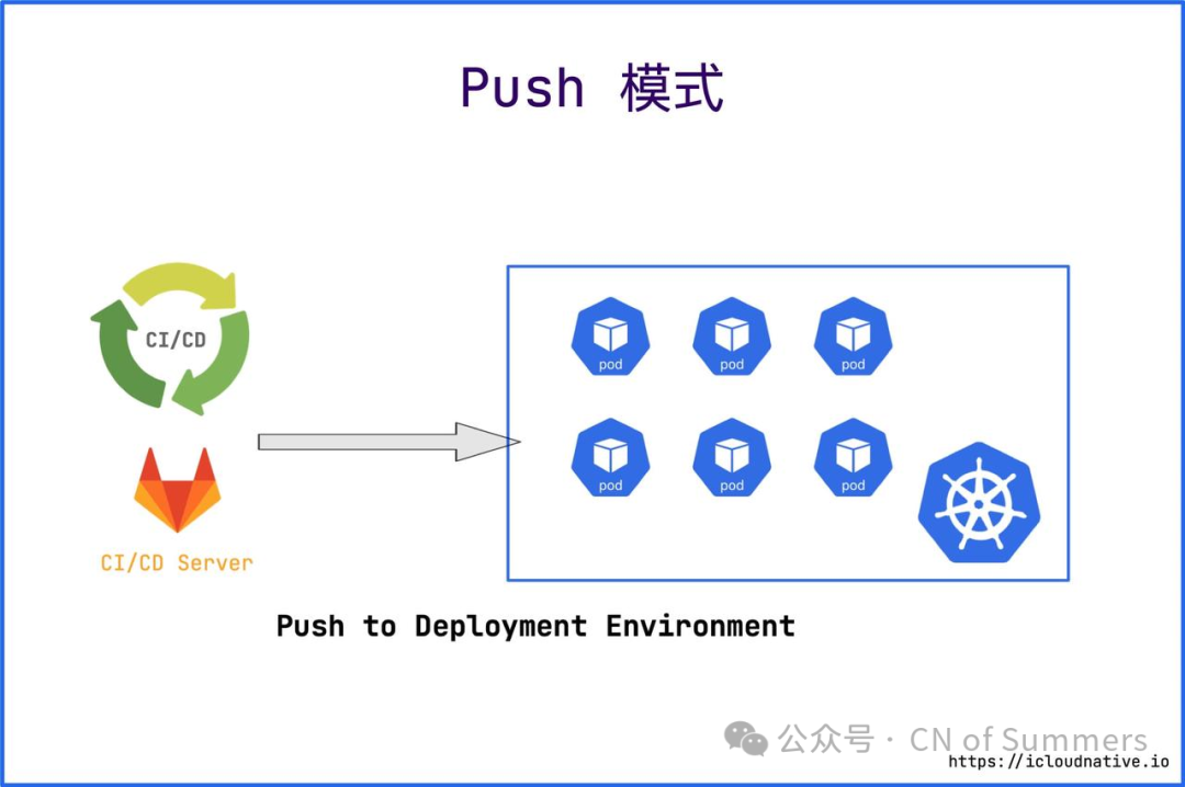 目前大多数 CI/CD 工具都使用基于 Push 的部署模式,例如 Jenkins、CircleCI 等。这种模式一般都会在 CI 流水线运行完成后执行一个命令(比如 kubectl)将应用部署到目标环境中。