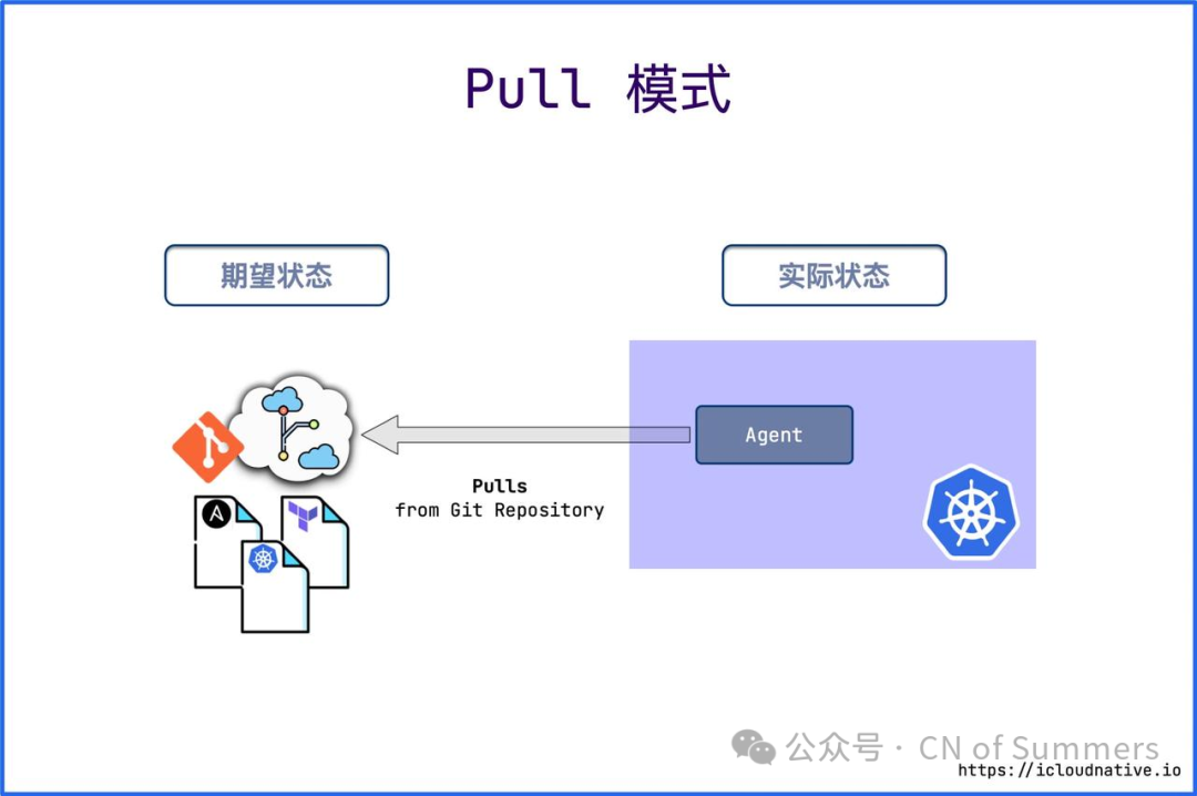 Pull 模式会在目标环境中安装一个 Agent,例如在 Kubernetes 集群中就靠 Operator 来充当这个 Agent。Operator 会周期性地监控目标环境的实际状态,并与 Git 仓库中的期望状态进行比较,如果实际状态不符合期望状态,Operator 就会更新基础设施的实际状态以匹配期望状态。