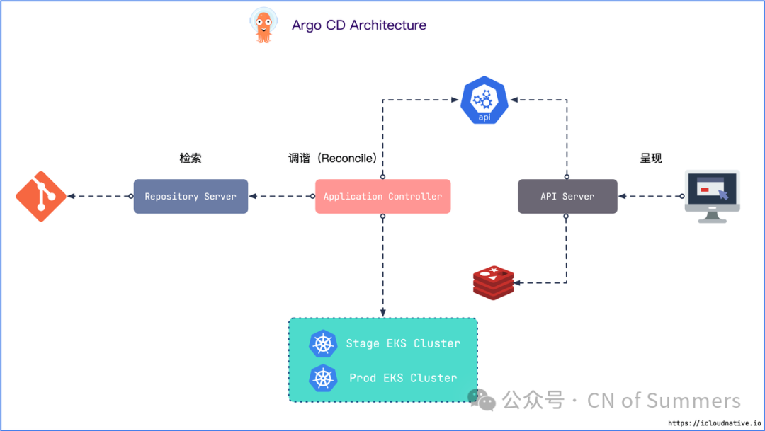 从功能架构来看,Argo CD 主要有三个组件:API Server、Repository Server 和 Application Controller。从 GitOps 工作流的角度来看,总共分为 3 个阶段:检索、调谐和呈现。