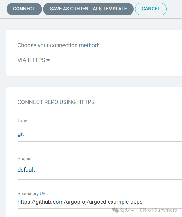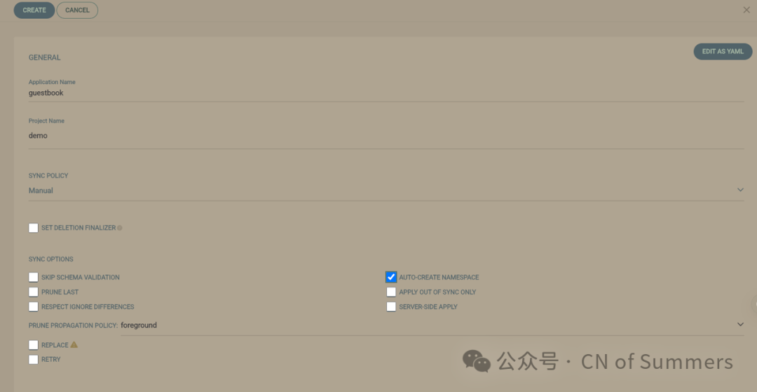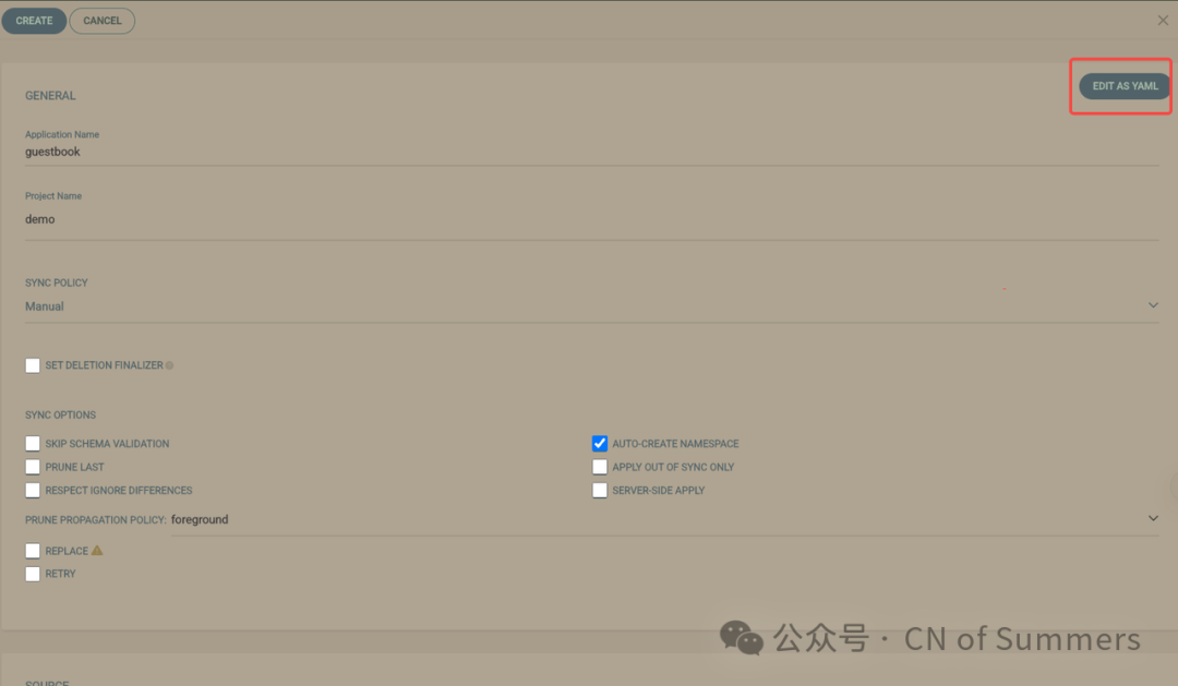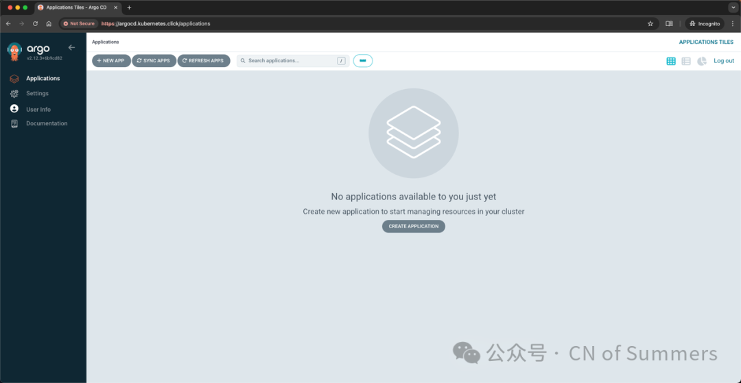 更多配置信息可以前往文档 https://argo-cd.readthedocs.io/en/stable/operator-manual/declarative-setup/ 查看,项目创建完成后,在该项目下创建一个 Application,代表环境中部署的应用程序实例。