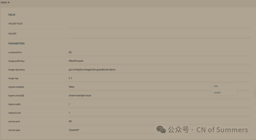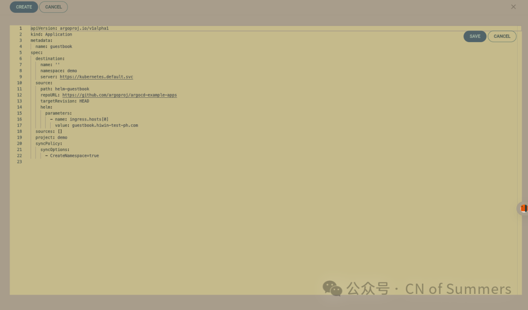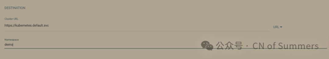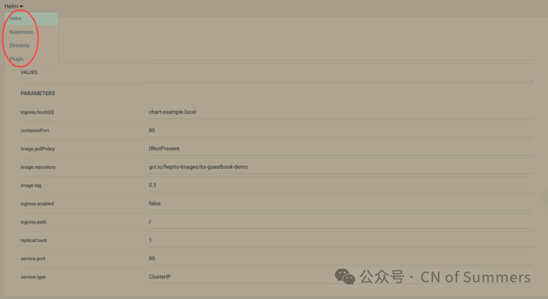 这里我们定义了一个名为 gitop-demo 的应用,应用源来自于 helm 路径,使用的是 values.yaml 文件,此外还可以通过 source.helm.parameters