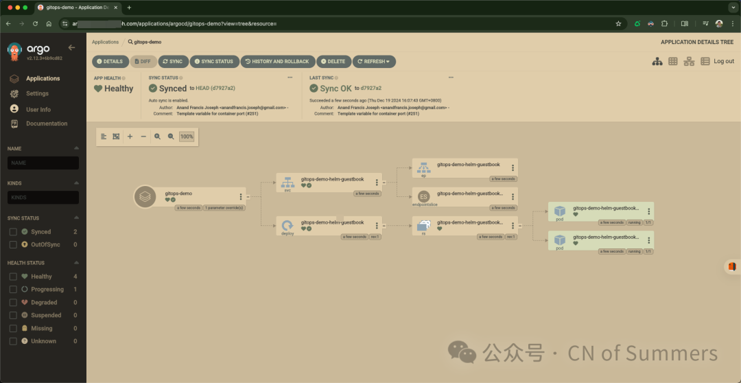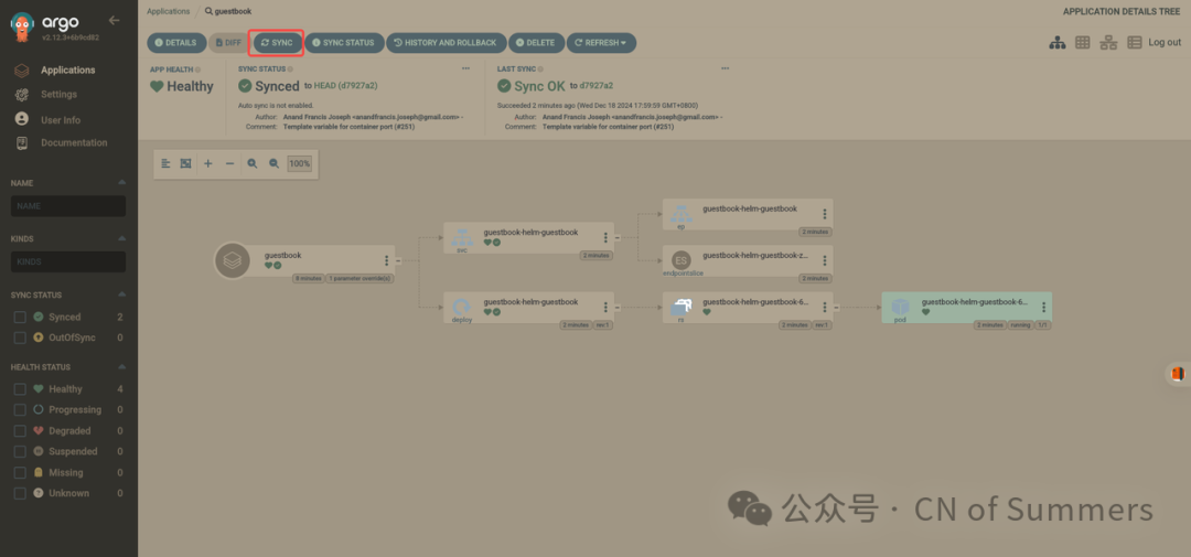 此命令从 Git 仓库中检索资源清单并执行 kubectl apply 部署应用,执行上面命令后 guestbook 应用便会运行在集群中了,现在我们就可以查看其资源组件、日志、事件和评估其健康状态了。
