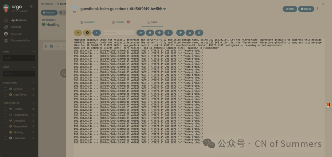 同步完成后可以看到我们的资源状态,甚至还可以直接查看应用的日志信息: