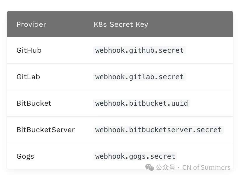 然后在 argocd-secret 这个 Kubernetes Secret 中,使用上面配置的 Git 提供商的 Webhook 密钥配置以下密钥之一。