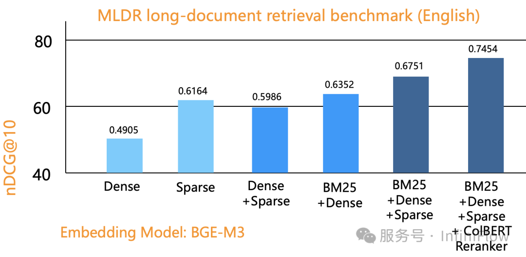 下图是我们利用 Infinity 数据库在一个公开评测数据集上,分别利用单路召回(向量、稀疏向量、全文搜索)、2 路召回、3 路召回评测的结果。纵坐标是排序质量,可以看到,3 路召回确实可以达到最好的效果,这用单一数据库完全验证了 BlendedRAG 的实验结果。图中最右侧是 3 路召回 + 基于张量的重排序得到的结果,关于这点,我们在下文还有提及。