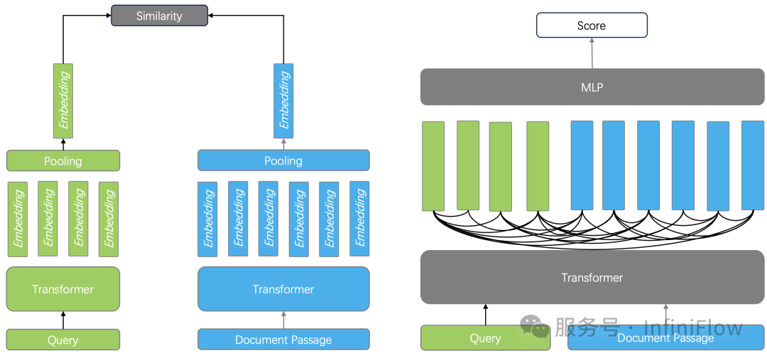如下图所示,左边就是 Embedding 模型的工作方式:分别对查询和文档进行编码,然后经过 Pooling 后输出一个向量,在排序阶段只需要计算向量相似度。由于丢失了查询和文档中 Token 之间两两之间的交互信息,因此会丢失很多语义信息,所以向量搜索常用来做粗筛。