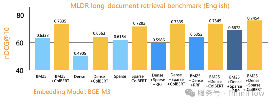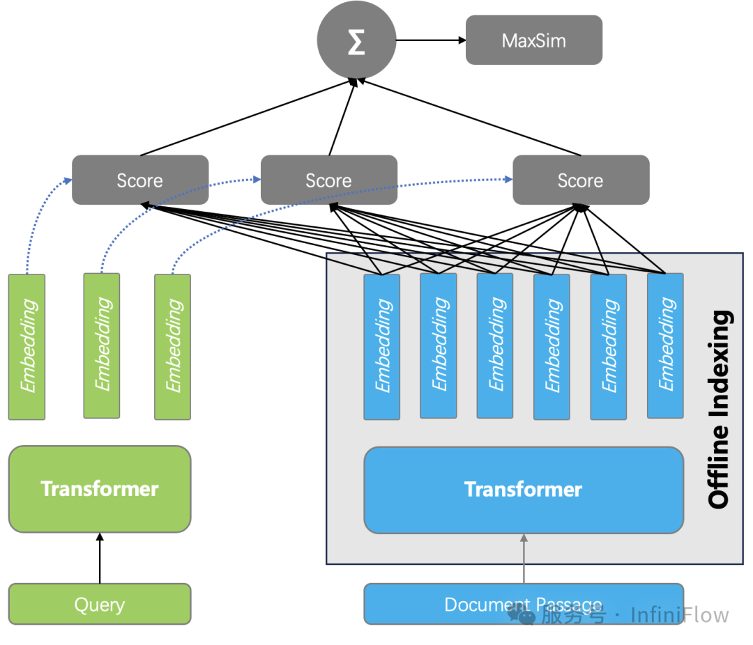 它的具体做法是:在索引阶段保存 Encoder 为每个 Token 生成的 Embedding,因此对于一个文档来说,就是用一个张量 Tensor (或者多向量)来表示一个文档,在查询的时候,只需要生成查询的每个 Token 的 Embedding,然后计算所有查询和 Text Çhunk 之间所有 Token 两两之间的相似度,累加就是最终文档得分。这种重排序,同样捕获了 Token 之间的交互信息,所以理论上可以做到跟 Cross Encoder 接近或者持平的效果。