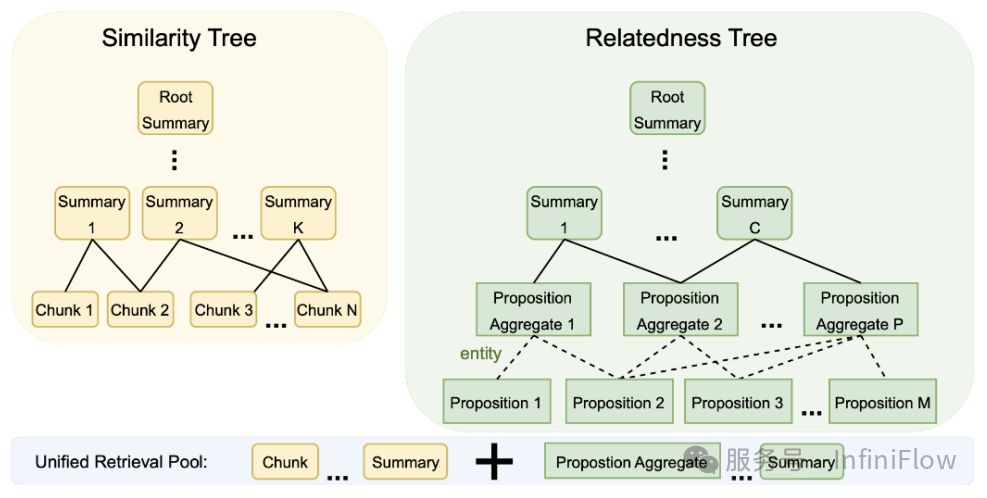 在 2024 年底的时候,在 RAPTOR 基础之上又有了 SiReRAG【参考17】,它对于文本召回有了更细粒度的定义:文本之间分别采用相似度和相关性衡量不同维度的需求,如下图所示:相似度就是直接采用向量或者全文搜索等其他手段计算 Text Chunk 之间的语义距离,这就是 RAPTOR 本身,也是图中左边的部分;相关性表示 Text Chunk 之间存在某种关联,它首先通过采用 LLM 从每个 Text Chunk 提取命名实体,再根据命名实体跟 Text Chunk 之间的关系构建层次化树状结构,就是图中右边的部分。