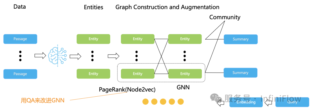 不论是 Fast GraphRAG,还是 HippoRAG,都可以用下图进行模拟。在这个图中,我们还添加了 GNN 的元素,这是因为在 2024 年,基于图神经网络来改进基于知识图谱问答的工作也出现了不少,例如【参考18】等,【参考19】还提供了这方面的概述。有兴趣了解的同学可以移步文献自行阅读。由于 GNN 的工作通常需要借助于用户数据进行额外训练,例如借助客户已有的问答数据对知识图谱中的命名实体产生更好的 Graph Embedding 表示,这些工作涉及到很高的定制化成本,因此不在本文的主要涵盖范围内。