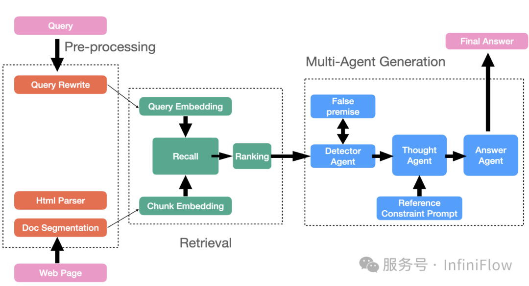 把 RAG 跟这样的 Agent 集成到一起,可以解锁更多的场景:例如下图的组合方式【参考41】,在这里,系统存在多个可以自主决策的 Agent ,它可以把复杂的问答分解为多个子任务,每个 Agent 负责特定的功能,这种分工可以提高系统的整体效率和准确性。图中,Detector Agent 旨在识别可能包含错误假设和前提的查询,这些查询会影响 LLM 回答的准确性;Thought Agent 负责处理和分析所有检索到的内容信息,它综合数据得到结论,并生成一系列详细的 Reasoning 思考结果;Answer Agent 利用 Through Agent 的输出产生答案,它的目的是在多轮对话中确保答案的输出受到最新的逻辑影响。