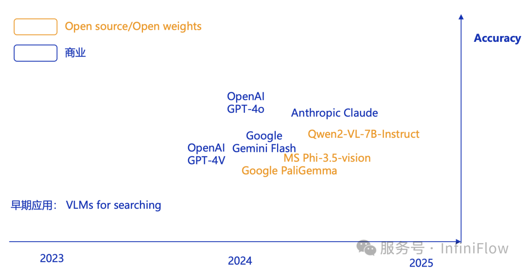 首先是 VLM 的涌现。如下图所示:我们看到,在过去以简单的图像搜索为主要场景的 VLM 在 2024 年年中得到了快速进化。