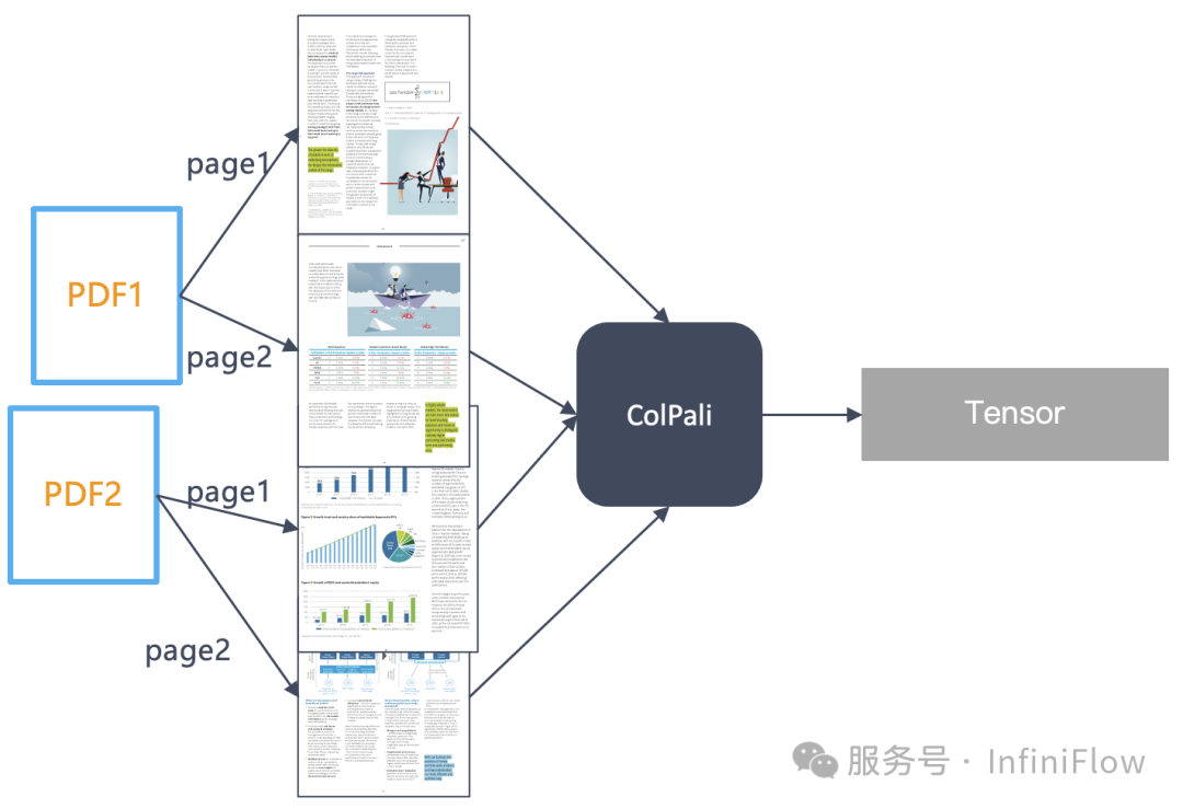 实现这一点,一种方案来自前文的介绍,也就是说我们采用模型来把多模态文档转成文本,然后再建立索引,提供检索。另一种就是根据 VLM 的进展,直接生成向量,规避掉复杂的 OCR 过程。对于后者,2024 年夏天出现的 ColPali【参考44】是开创性的工作,它把一张图片看作 1024个 Image Patch,分别生成 Embedding,因此一张图片就是用一个张量来表示: