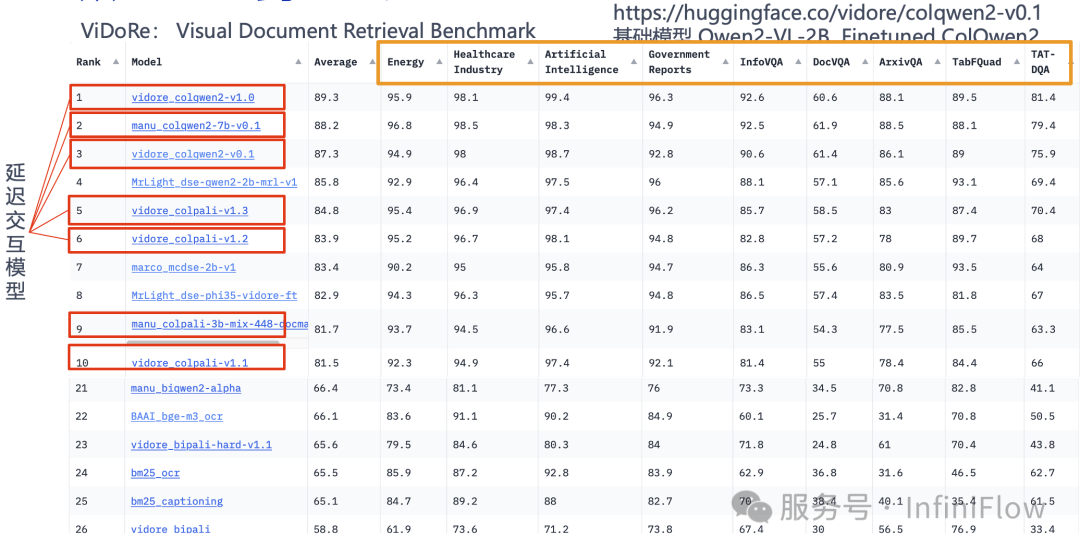 下图是多模态 RAG 召回的一个榜单,可以看到,基于张量的系列延迟交互模型,取得了大量领先的位置: