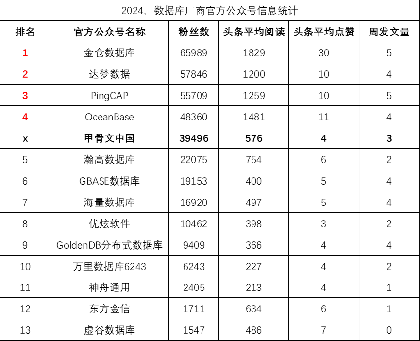 2024年,马上就要结束,作为信创数据库厂商们在这一年里对各自官方公众号运营都有不同的突出表现。以下是根据第三方媒体分析平台(极致了数据)提供的信息进行汇总统计(不包括阿里云、华为云、腾讯云这三家没有独立数据库公众号的厂商)。各数据库厂商公众号的粉丝数、头条平均阅读量、头条平均点赞量、周发文量统计如下: