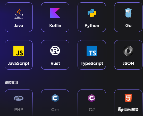 目前支持Java、Kotlin、python、Go等后端主流语言,同时会在后续版本中适配PHP、C++、C#和HTML,对我们Java开发者来说,目前的编程语言支持度已经完全够用了。