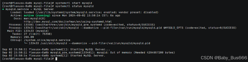 执行命令启动 mysql 服务: systemctl start mysqld ,绿色的 active(running)表示启动成功!