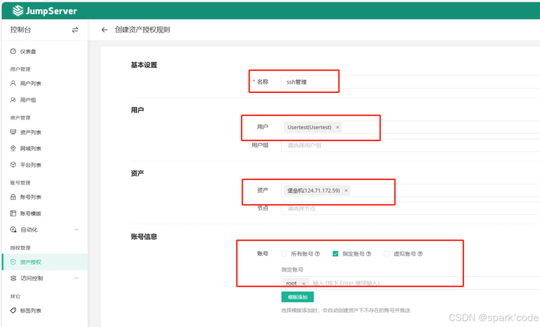 在授权管理中的资产授权将创建好的 ssh 资源授权给 Usertest 用户。