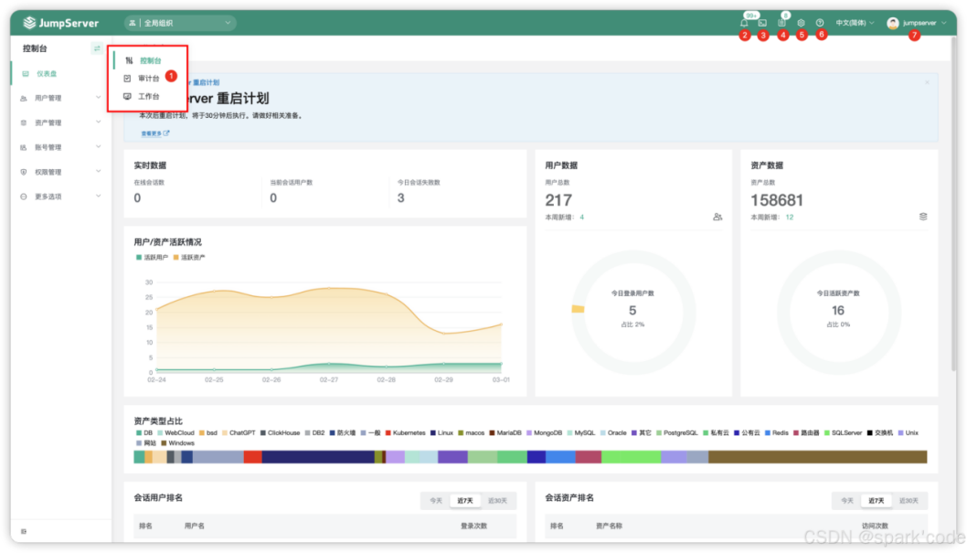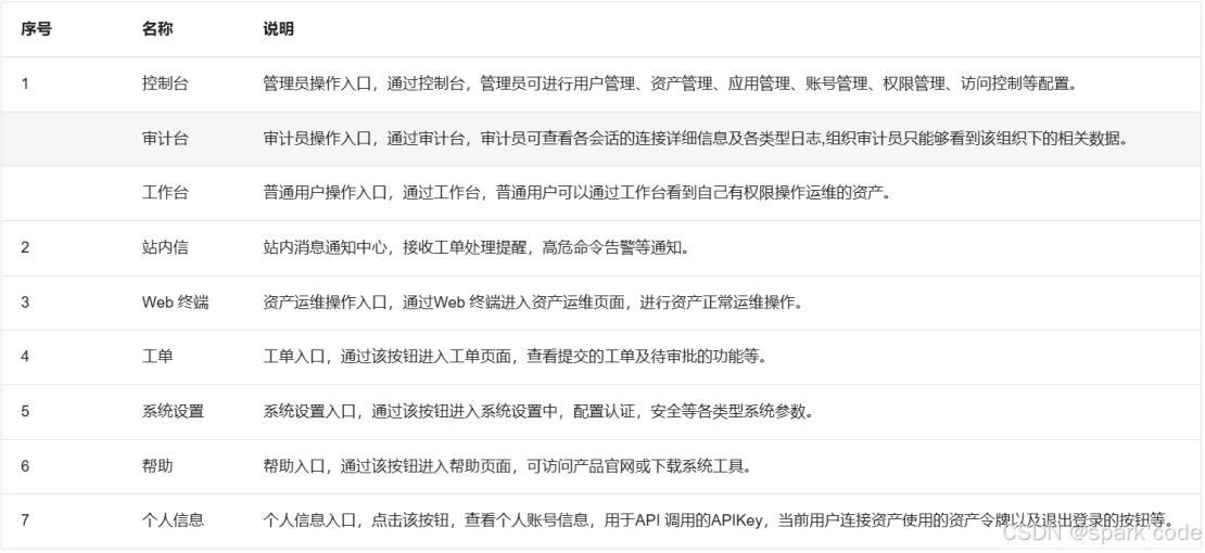 · 右上方区域为功能按钮,可以快速跳转站内信、Web 终端、工单、系统设置等功能。
