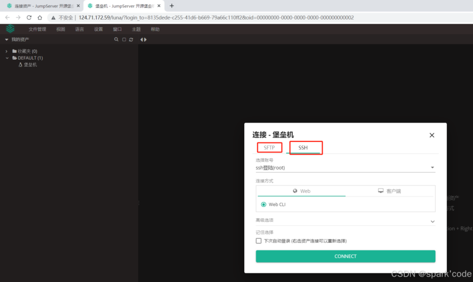 会跳到连接页面。可以选择 SFTP 和 SSH 两种模式,选择后 CONNECT。