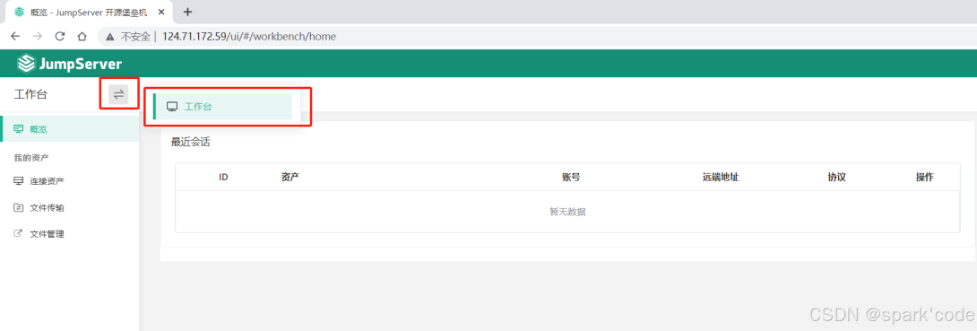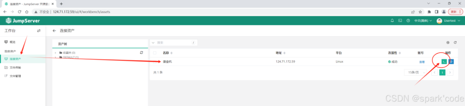 登陆成功之后切到工作台。在连接资产中就能看到添加的 ssh 资产了。