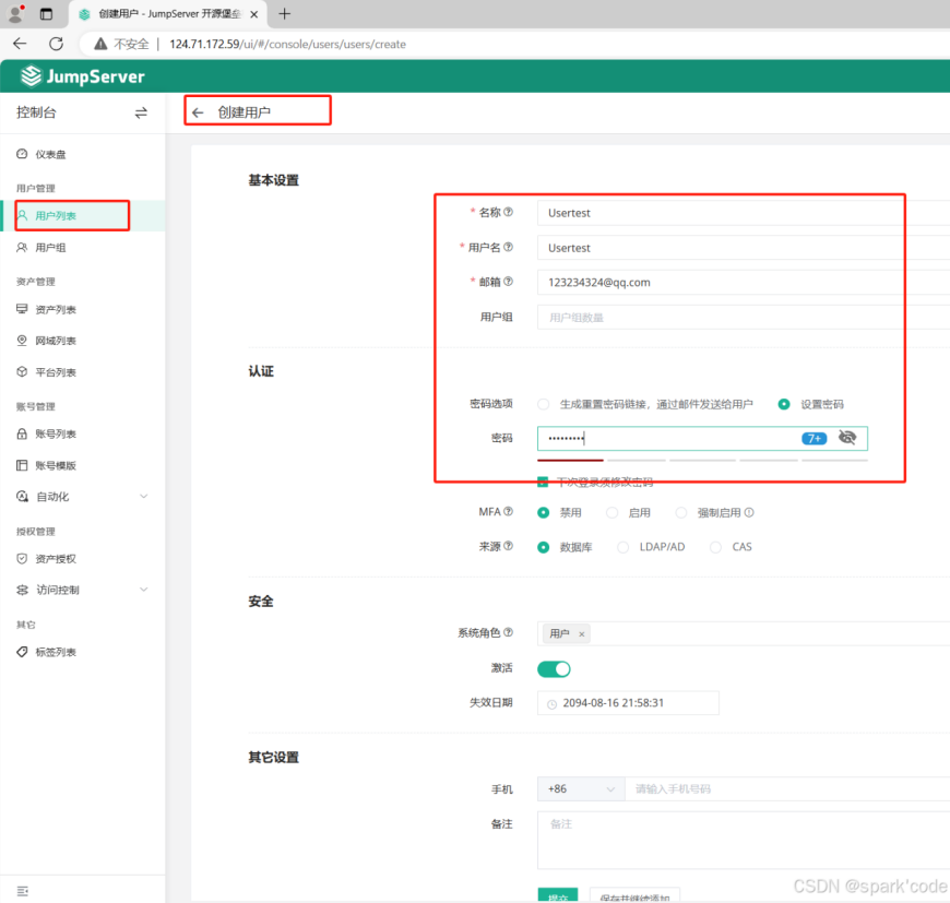 在用户管理-用户列表中创建用户,填写好基本信息和密码。
