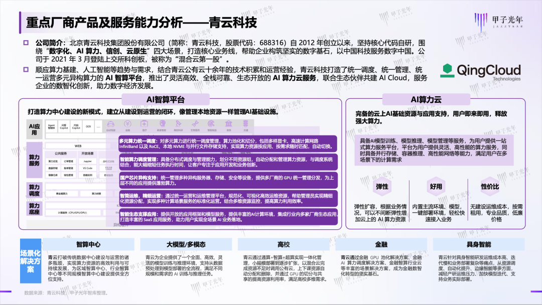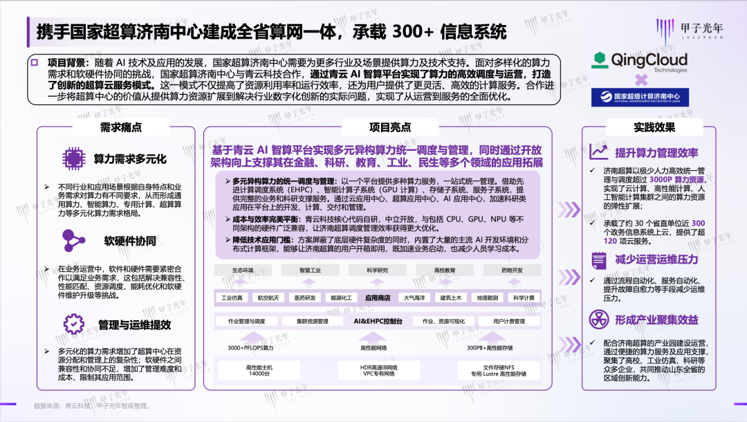 甲子光年智库发布《中国 AI 算力行业发展报告》,在瞬息万状的 AI 产业发展过程中,对 AI 产业引发的算力资源需求变化进行观察与思考。在《实践落地,AI 算力应用新标杆》章节中,甲子光年将青云科技作为重点厂商,分析了 AI 智算平台与 AI 算力云等产品及服务能力,介绍了青云针对智算中心、大模型/多模态、高校科研、金融、具身智能等场景的解决方案。青云科技携手国家超算济南中心的合作也作为标杆案例入选。双方将智算中心的价值从提供算力资源扩展到解决行业数字化创新的实际问题。最终,国家超算济南中心不仅以极少人力高效统一管理与调度超过 3000P 异构多元算力资源,承载了约 30 个省直单位近 300 个信息系统上云,更是配合产业园建设运营,通过便捷的算力服务及应用支撑,聚集了高校、工业仿真、科研等众多企业,共同推动区域创新。 点击“阅读原文”或扫描二维码 获取完整报告 点击下方视频了解青云 AI 智算 - FIN -