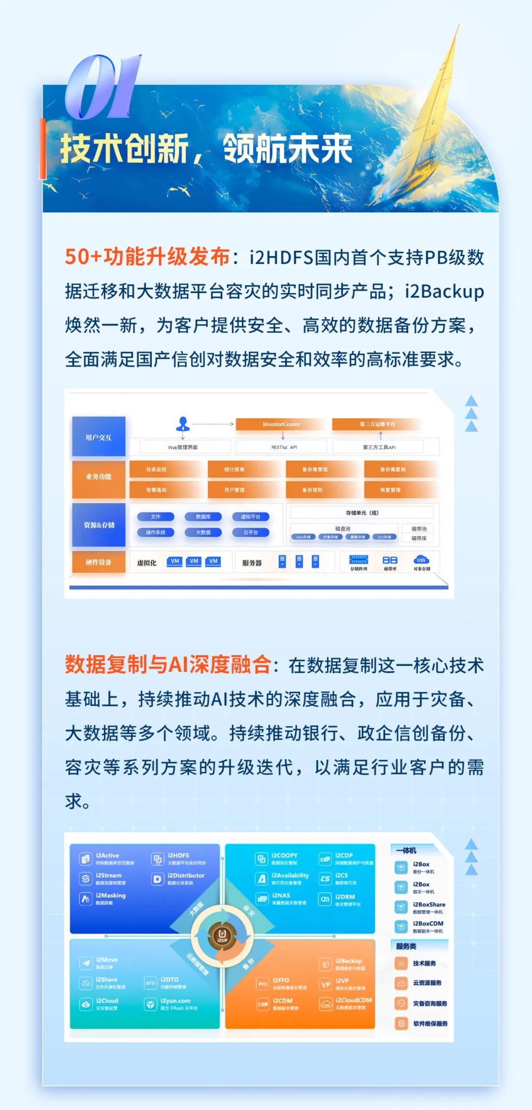 公司围绕客户需求持续创新,与合作伙伴开放合作,在金融、党政军、医疗、教育、运营商、能源、制造和互联网等领域构筑了多层次、多策略、全域、全生态的数据管理方案。公司坚持以自主研发的数据复制技术为核心,围绕数据这个新型生产要素所覆盖的应用场景,为用户提供数据安全、混合云灾备、数据库同步、数据迁移、数据副本管理、大数据收集与分发等产品方案,帮助用户从Internet+向Data+转型,让数据赋能用户业务增长