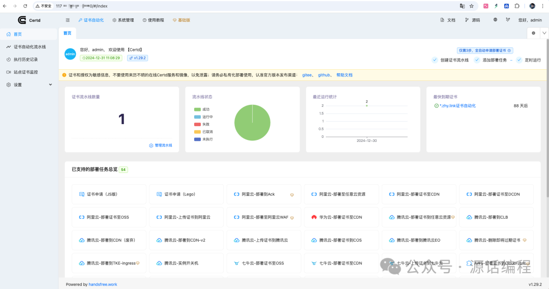Certd 作为一个自动化 SSL 证书管理工具,极大地简化了证书的申请、部署和更新过程,确保了网站的安全性。通过本文的介绍,相信读者已经了解了 Certd 的安装部署和使用方法。无论是个人开发者还是企业用户,Certd 都能提供全面的功能和自动化的解决方案,帮助用户轻松管理和更新 SSL 证书。