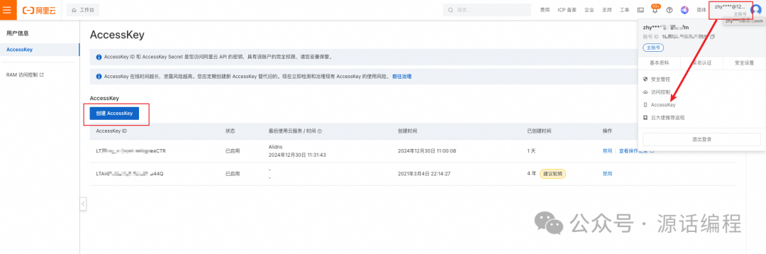 ,以阿里云为例,点击右上角账号信息,再点击AccessKey