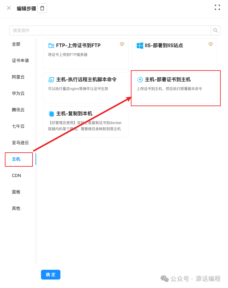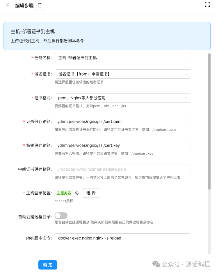 证书格式:选择 pem,Nginx等大部分应用证书保存路径:填写应用原本的证书保存路径,路径要包含证书文件名,例如:/tmp/cert.pem 私钥保存路径:填写应用原本的证书保存路径,路径要包含证书文件名,例如:/tmp/cert.pem 主机登录配置:添写服务器主机相关信息 shell脚本命令:填写服务器主机要执行的命令 运行策略:成功后跳过(非整数任务请选择它),证书没过期不需要重复部署