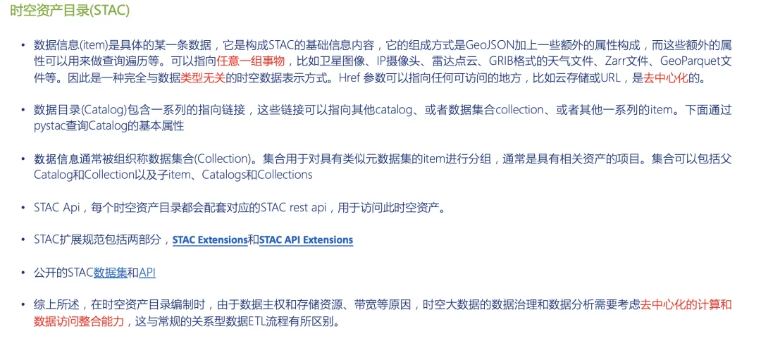 过去,GIS 厂商和相关产品主要关注在处理光栅和特征数据, 但是对于“时空大数据”来说, 不应该把数据类型限制在这两种上。 我们需要一种真正的非数据类型相关方法来查看时空数据,对数据仓库和数据湖的数据做时空特征标注和分析。对此国内外也研究了很多方法, 我们选择了时空资产目录 (STAC)规范。