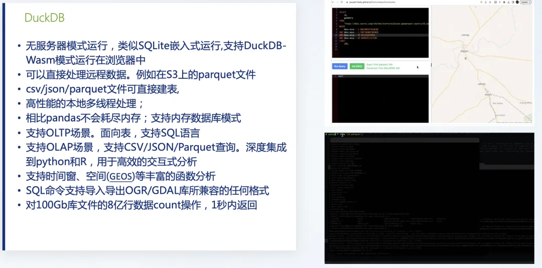 DuckDB 是近几年比较火的数据库,可以做一些 OLAP 分析,它的分析能力比较强,性能非常高。它可以在浏览器端使用,可以直接读取 S3 或其他平台的数据。同时,它对于时间窗口函数或空间函数支持程度非常高。