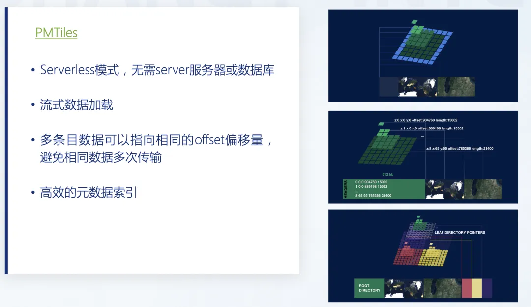 PMTiles 是一个 Serverless 的空间加载技术,可以做流式数据加载。我们把空间数据文件或多条目数据放在云存储上后,它可以基于所要定位的空间区域,按照 offset 偏移量去加载内部的一份数据,可以避免整体的数据传输。在传统的 GIS 方案里,通常会把整体数据加载到内存里或浏览器里展现,速度会很慢。