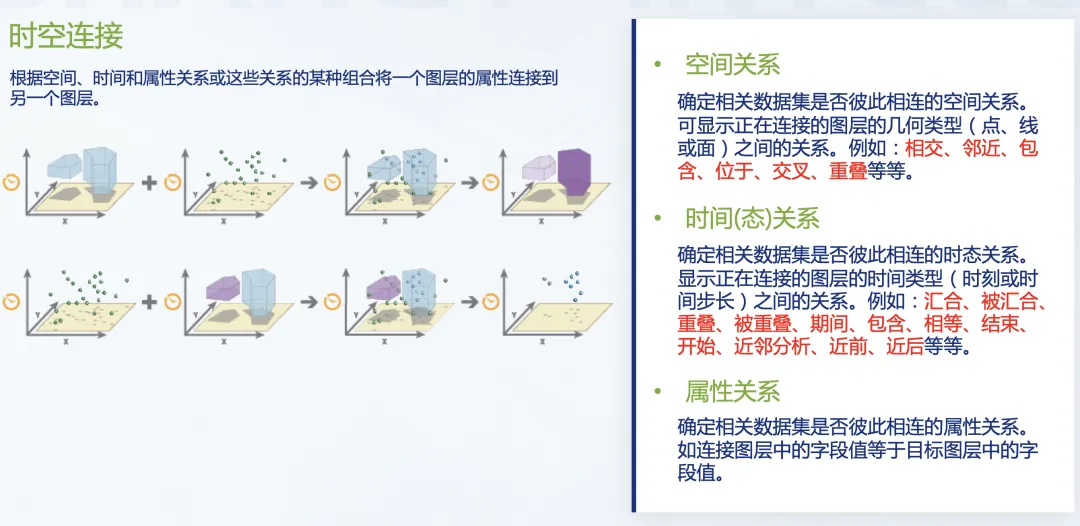 上图左边的是时序数据分析,比如按时间查询,按窗口函数处理;右边是空间数据分析,有一些空间数据分析函数。例如空间关系有一些相交临近,如点线面之间的关系情况。时态的关系是本身的空间数据与时间对比,是相邻,还是包含。