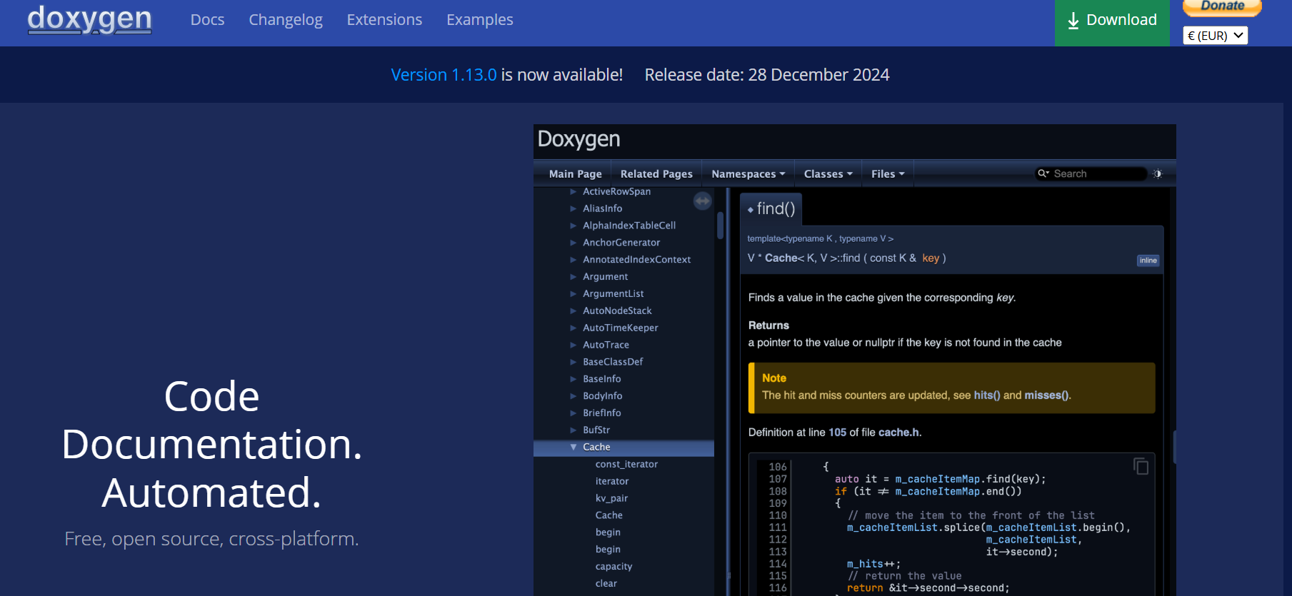 Doxygen可以从一组注释过的源文件生成在线文档浏览器(HTML格式)和/或离线参考手册(LaTeX格式)。文档直接从源代码中提取,这使得文档与源代码保持一致变得更加容易。
