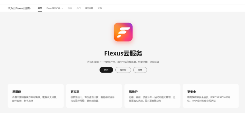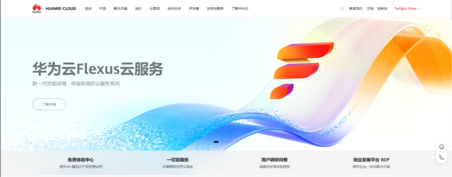 来到华为云首页,我们可以看到华为云 Flexus 云服务的海报,点击了解详情,即可进入 Flexus 云服务产品介绍页。