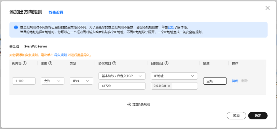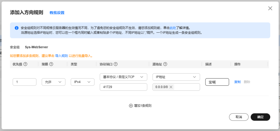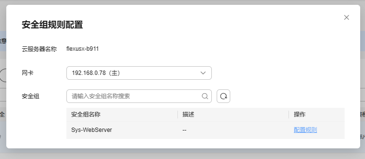 点击蓝色配置规则字体,配置 Sys-WebServer 安全组。