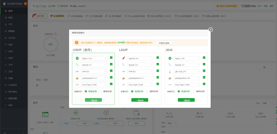 进入宝塔面板,安装推荐的 LNMP 四件套 ���️���。