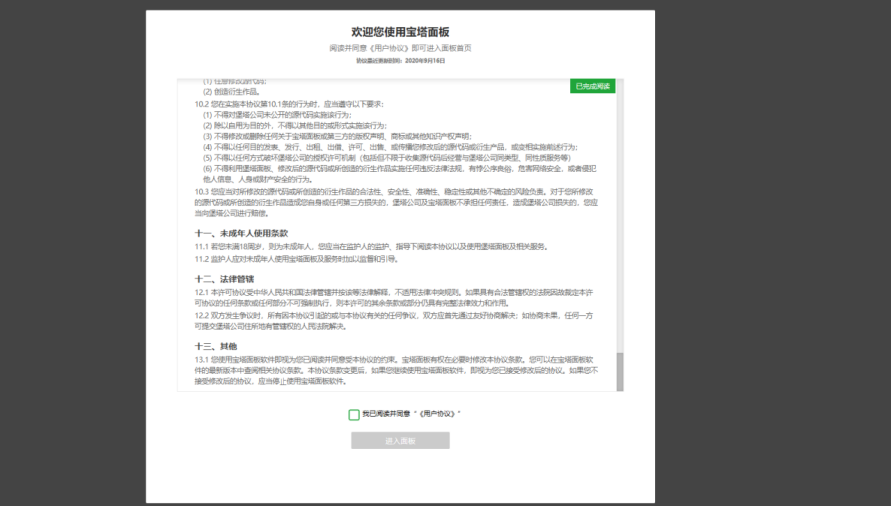 初次安装并使用宝塔面板需要阅读并同意用户协议,阅读协议并勾选✔️即可进入。