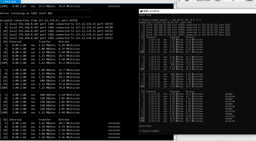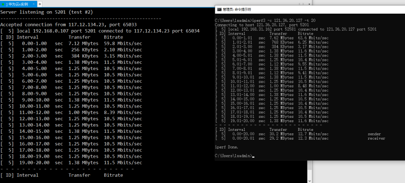 为了测试从客户端到服务器的单向 TCP 带宽,我们首先在华为云 X 实例上启动服务器模式: