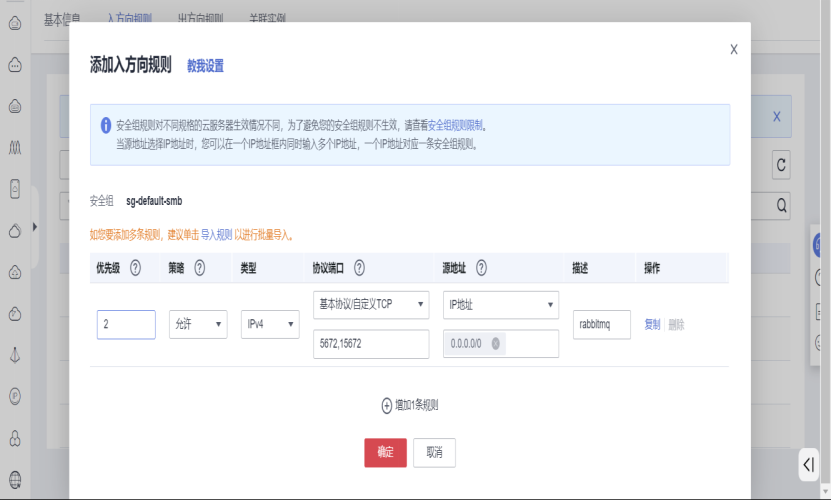 docker 安装 rabbitmq 在线拉取: docker pull rabbitmq:3-management 执行下面的命令来运行 MQ 容器: docker run \ -e RABBITMQ_DEFAULT_USER=‘mq 账号’ \ -e RABBITMQ_DEFAULT_PASS=‘密码’ \ --name mq \ --hostname mq1 \ -p 15672:15672 \ -p 5672:5672 \ -d \ rabbitmq:3-management firewall-cmd --add-port=3306/tcp --permanent # --add-port=3306/tcp 表示放行 3306 端口的 tcp 访问,--permanent 表示永久生效firewall-cmd --reload # 重新载入防火墙规则使其生效 开放安全组以及防火墙端口 后面我就不再赘述喽