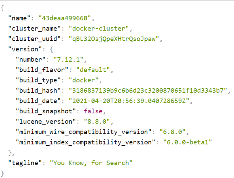 在浏览器中输入:http://你的ip:9200 即可看到 elasticsearch 的响应结果: