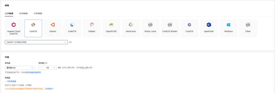 选择服务器常用的 CentOS7 系统,并选择存储系统盘,这里我选择 100GiB 通用 SSD,有很多类型的存储盘,大家可以参考下面表格进行选择。