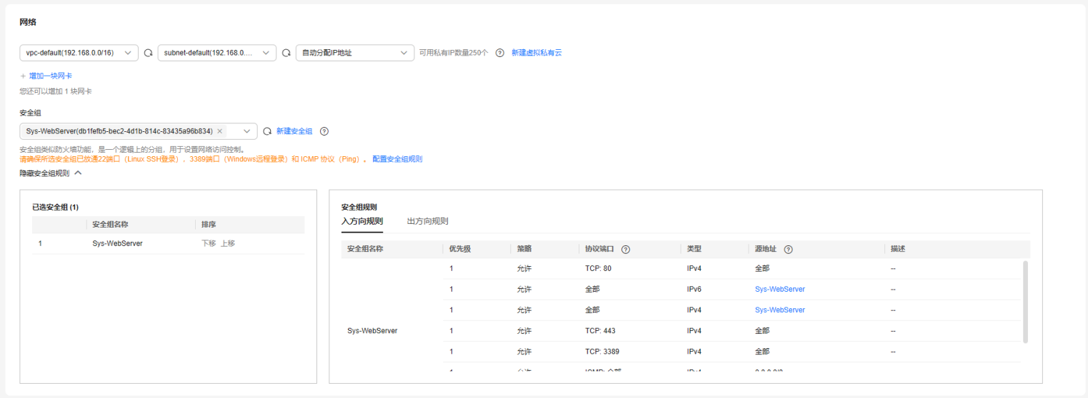 点击蓝色配置规则字体,配置 Sys-WebServer 安全组。