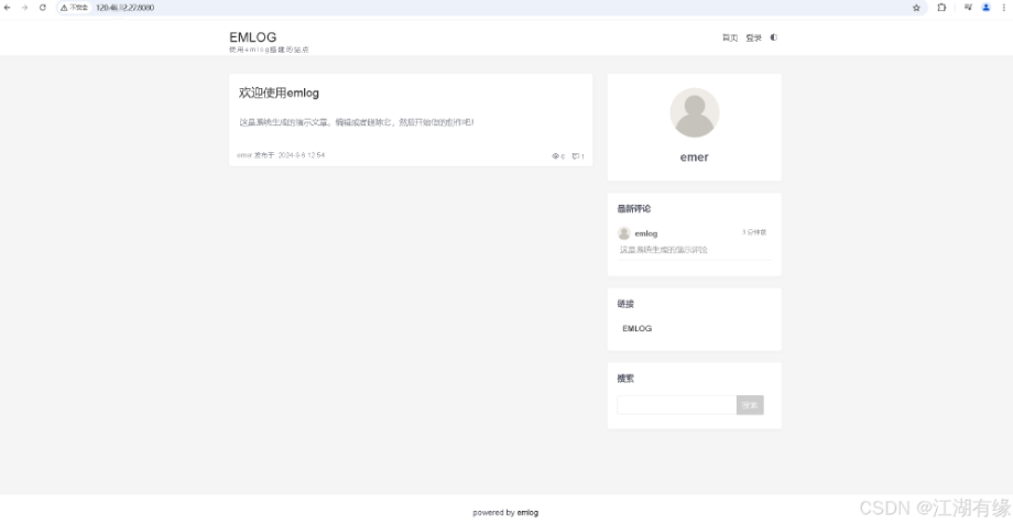 浏览器地址:http://弹性公网 IP 地址:8080,可以访问到 emlog 前台首页。