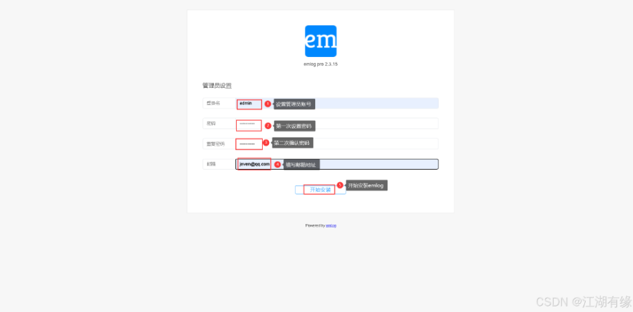 自定义设置管理员登录账号密码和邮箱地址信息,点击“开始安装”即可。