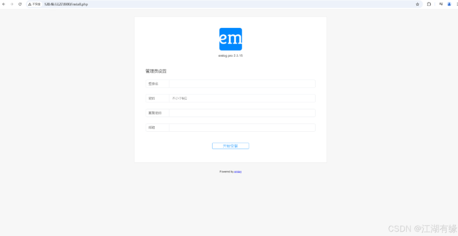 浏览器访问地址:http://弹性公网 IP 地址:8080,将 IP 替换为自己服务器 IP 地址。浏览器打开后,进入 emlog 初始页。