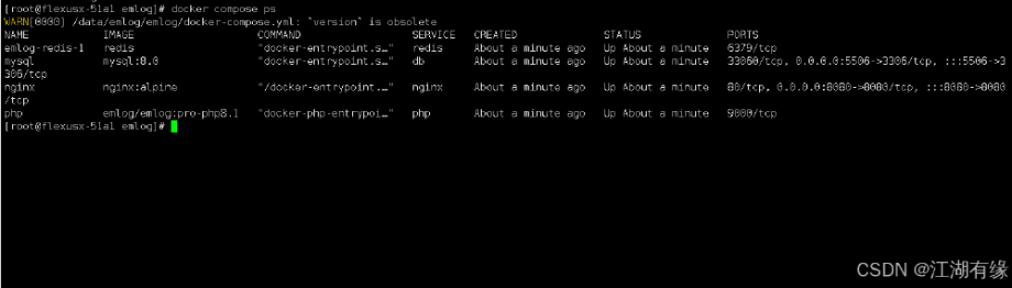 [root@flexusx-51a1 emlog]# docker compose psWARN[0000] /data/emlog/emlog/docker-compose.yml: `version` is obsoleteNAME IMAGE COMMAND SERVICE CREATED STATUS PORTSemlog-redis-1 redis "docker-entrypoint.s…" redis About a minute ago Up About a minute 6379/tcpmysql mysql:8.0 "docker-entrypoint.s…" db About a minute ago Up About a minute 33060/tcp, 0.0.0.0:5506->3306/tcp, :::5506->3306/tcpnginx nginx:alpine "/docker-entrypoint.…" nginx About a minute ago Up About a minute 80/tcp, 0.0.0.0:8080->8080/tcp, :::8080->8080/tcpphp emlog/emlog:pro-php8.1 "docker-php-entrypoi…" php About a minute ago Up About a minute 9000/tcp